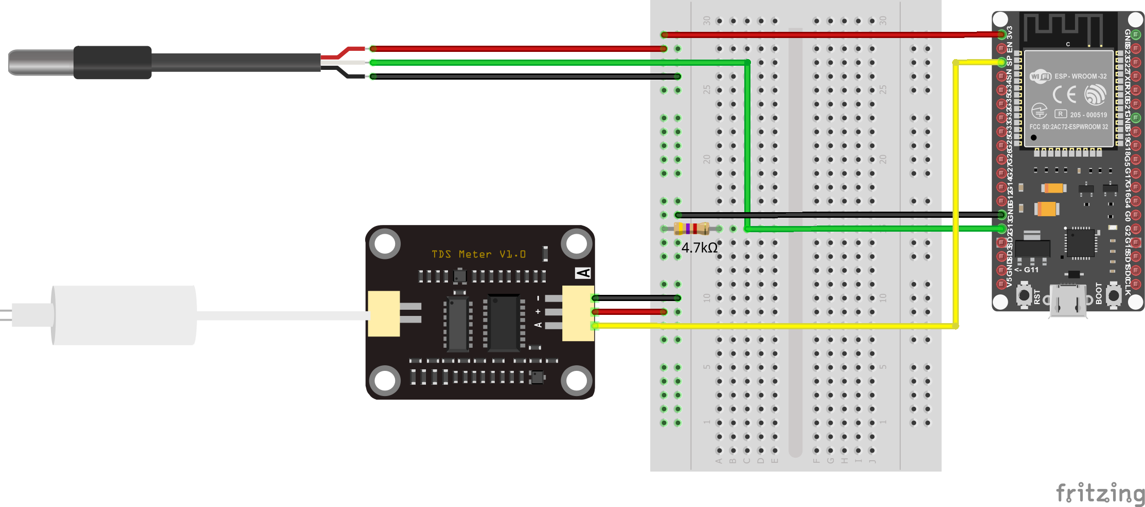 Der TDS Sensor kommt mit einem kleinen PCB, welches wir an den ESP32 anschließen. Zusätzlich zum analogen Wert müssen wir auch noch die Wassertemperatur messen. Dafür nehmen wir einen wasserfesten Temperatursensor.