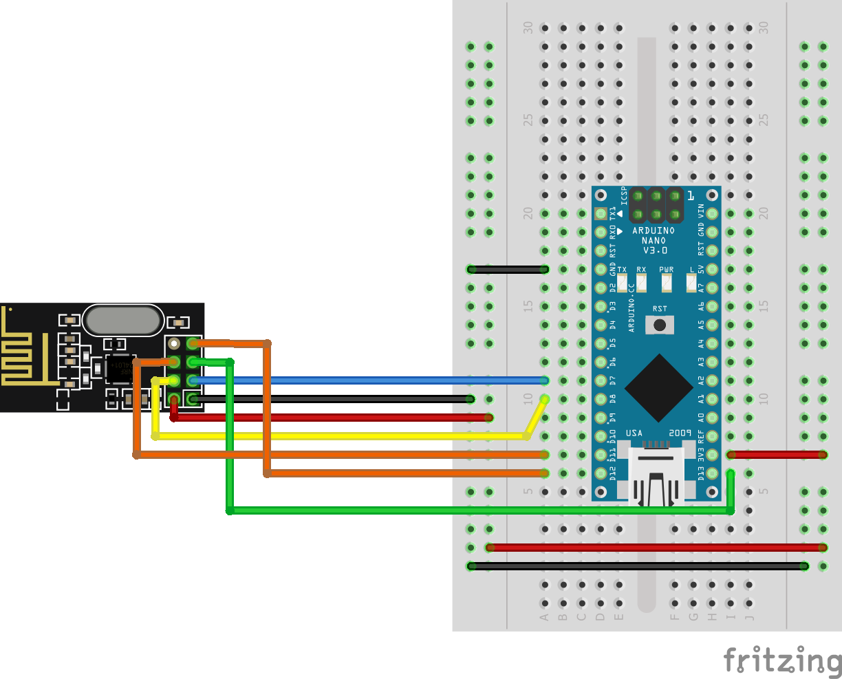 Bevor wir uns um die Bibliothek und anhängenden Beispiele kümmern, muss das 2.4 GHz Funkmodul erst einmal angeschlossen werden. Dabei ist die Verkabelung für Arduinos gleich. Ich habe wegen der geringen Größe ein Arduino Nano genommen, allerdings kann auch problemlos ein Arduino UNO verwendet werden. Die Pin-Verbindungen sind wie folgt: