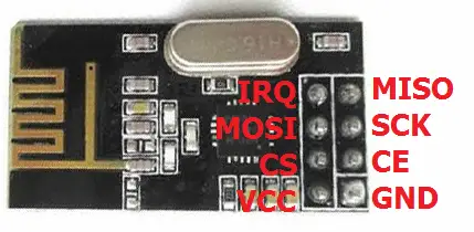 Wie du siehst hat der nRF24L01+ acht Pins, welche allerdings nebeneinander platziert sind, wodurch das Platzieren auf einem normalen Breadboard schwierig ist. Daher nutzen wir Female-Female Jumper Kabel als Verbindung zwischen GPIOs und den Pins. Da die Module nicht beschriftet sind, hier erst einmal die Pin Belegung: