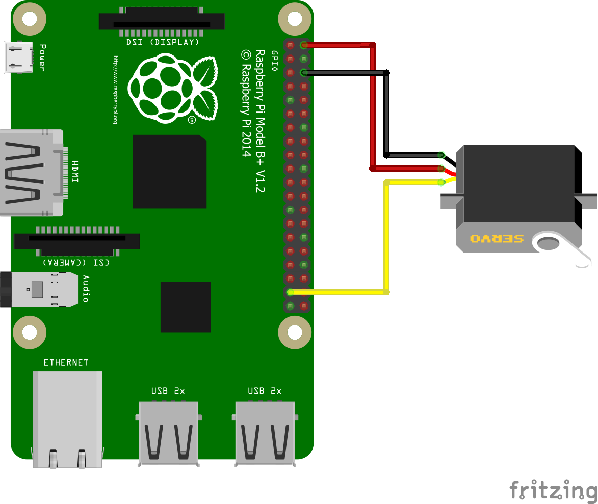Wie bereits erwähnt nehmen wir einen Servo Motor zum Schwenken. Es gibt hierbei mehrere Modelle, jedoch würde ich einen etwas stärkeren empfehlen (keinen SG-90). Da wir den Motor jeweils nur sehr kurz ansteuern ist auch der etwas höhere Stromverbrauch zu vernachlässigen. Neben einem Raspberry Pi werden folgende Komponenten gebraucht: