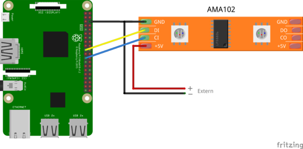 Der Anschluss an den Raspberry Pi ist identisch mit dem der WS2801 RGB LED Streifen: