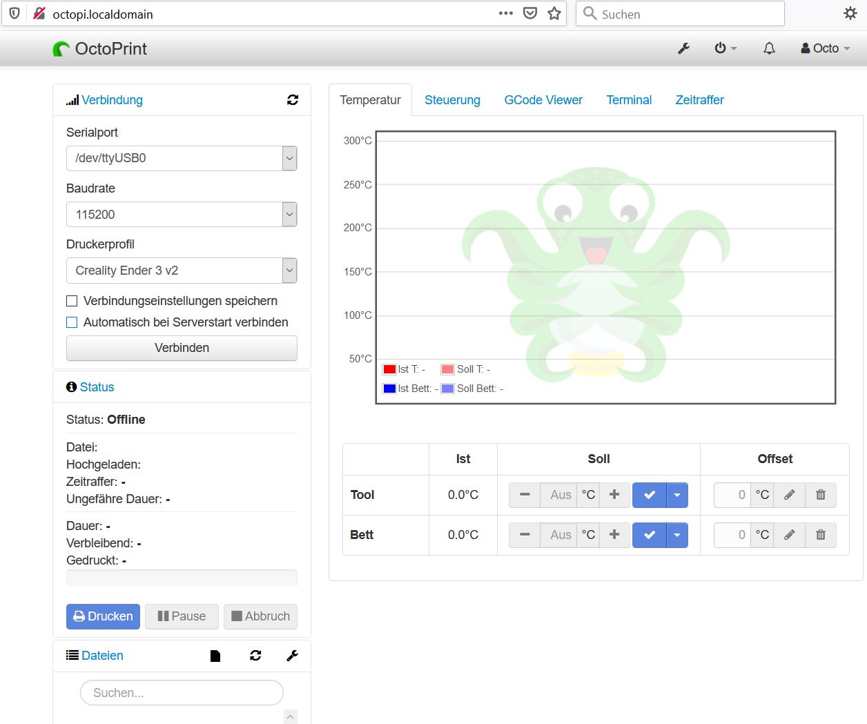 In meinem Fall (Ender 3 v2) musste ich noch ein Plugin installieren, damit die Temperatur richtig angezeigt wird.
