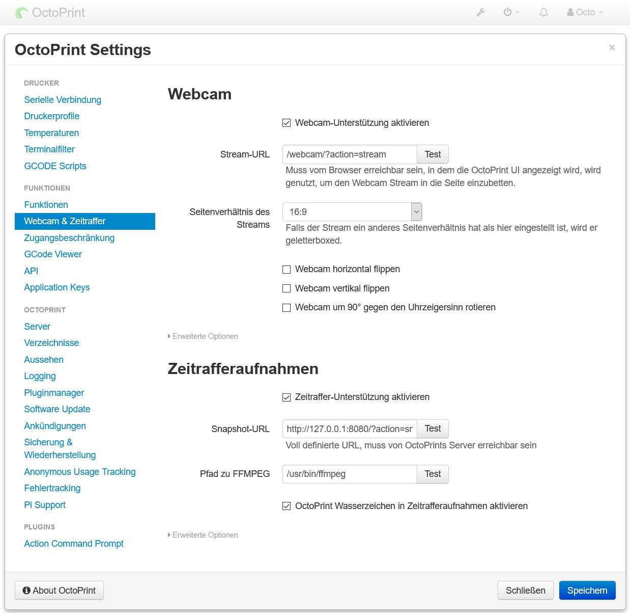 Verbinde also zunĂ€chst deine Kamera per USB oder dem CSI Anschluss. Entweder wirst du direkt ein Bild unter dem Reiter âSteuerungâ sehen, oder du musst den Raspberry Pi ĂŒber das MenĂŒ oben rechts zunĂ€chst neu starten. Sollte es danach noch nicht geklappt haben, kannst du unter Einstellungen > Webcam & Zeitraffer weitere Konfigurationen vornehmen.