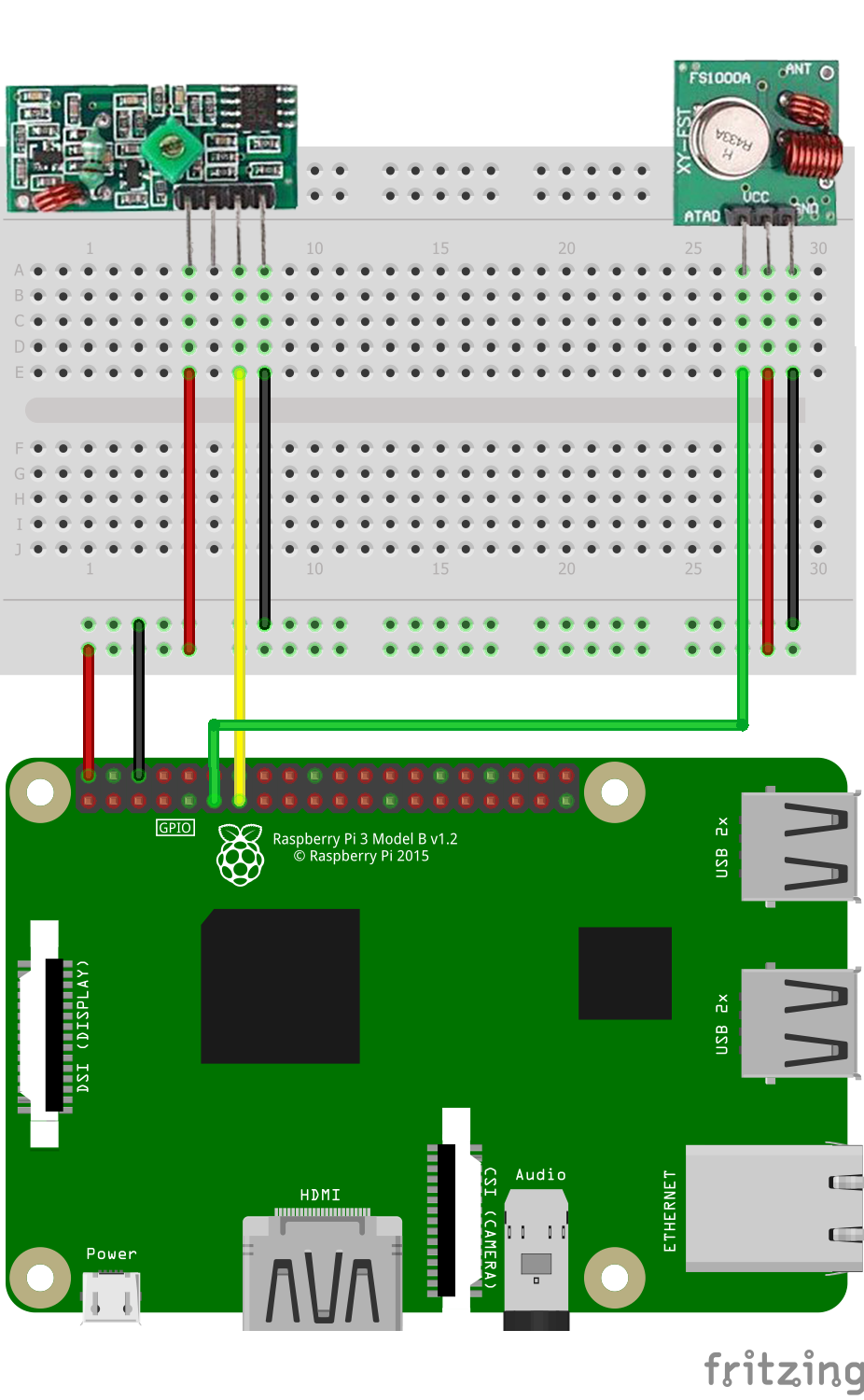 Darüber hinaus wird der ATAD (Daten) Pin des Senders (im Bild rechts) an GPIO 17 angeschlossen. Einen der mittleren beiden Pins des Empfängers schließen wir an GPIO 27 an. Die der schematische Aufbau:
