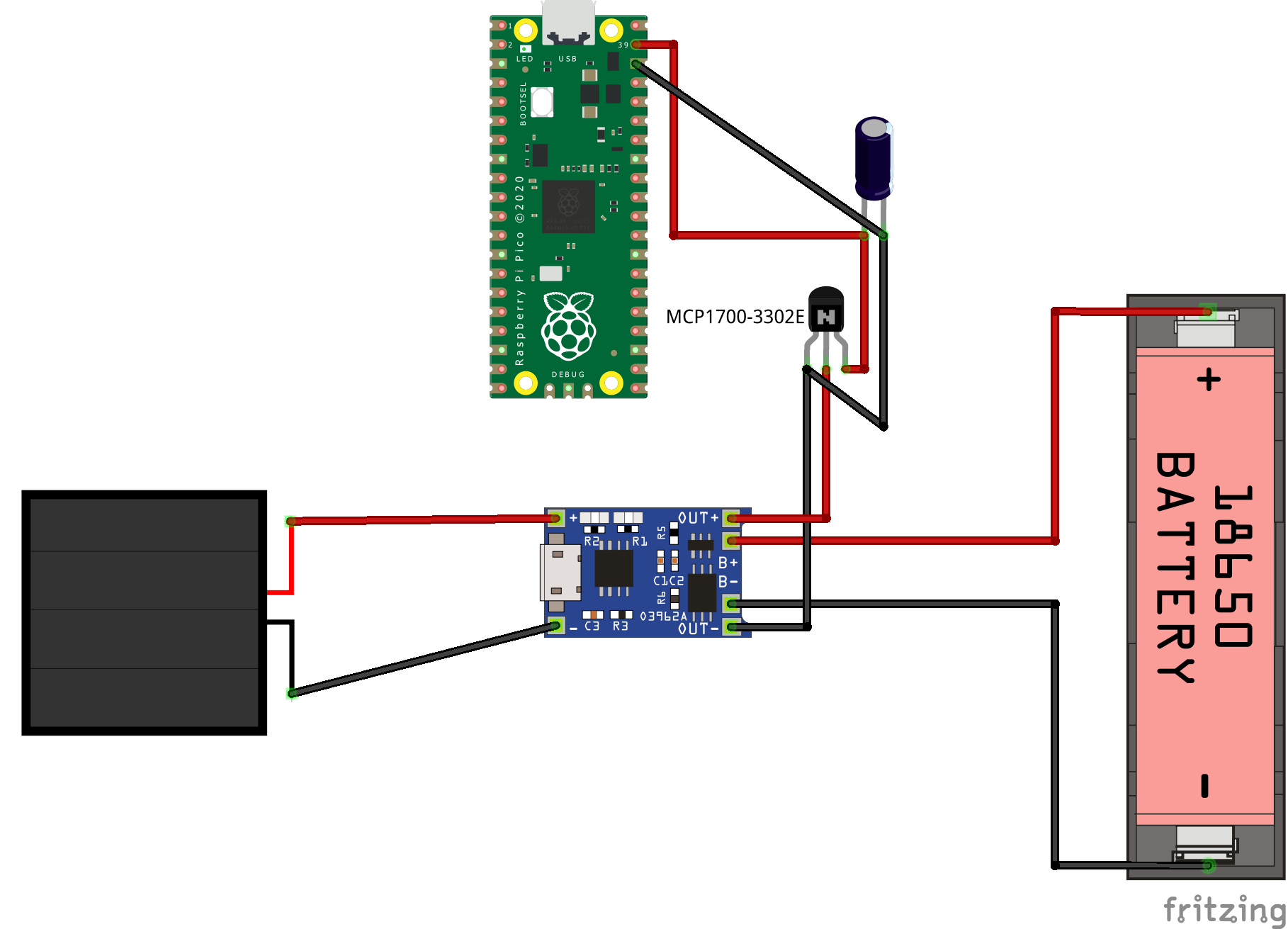 Je nach Tageslichtdauer und Größe der Solarzellen könnte der Strom u.U. nicht für rechenintensive Anwendungen reichen. Es empfiehlt sich daher einen kleineren, stromsparenden Raspberry Pi, wie das Modell Zero zu nehmen – oder optimalerweise einen Raspberry Pi Pico!
